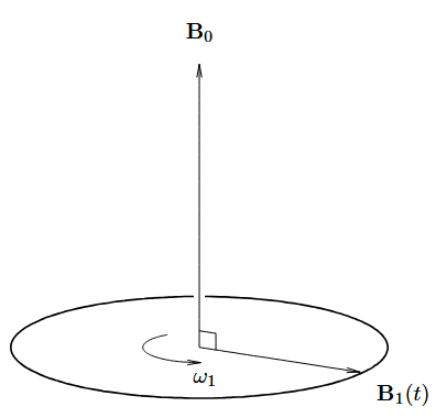However, in general, they are not equal. Which will make the behavior of the spin quite complicated. To simplify the understanding, we will change our frame of reference to the rotating frame of B1. In this frame, B1 will not be seen as changing its direction. It will behave as a static field. We can call it B10.