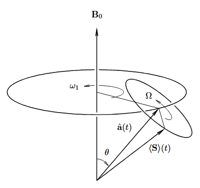 In the lab frame the spin S will precess about the direction of Beff lets call it \hat{\mathbf{a(t)}}. This axis \hat{\mathbf{a(t)}}, will itself precess about B0 as shown in Fig. 4.